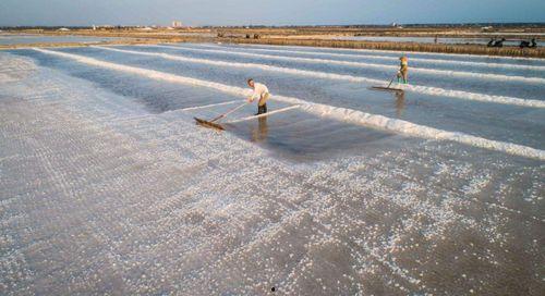晒盐过程中,盐工们会不断地翻动盐层,以防止盐粒结块。当盐层变得足够厚时,就可以开始收盐了。